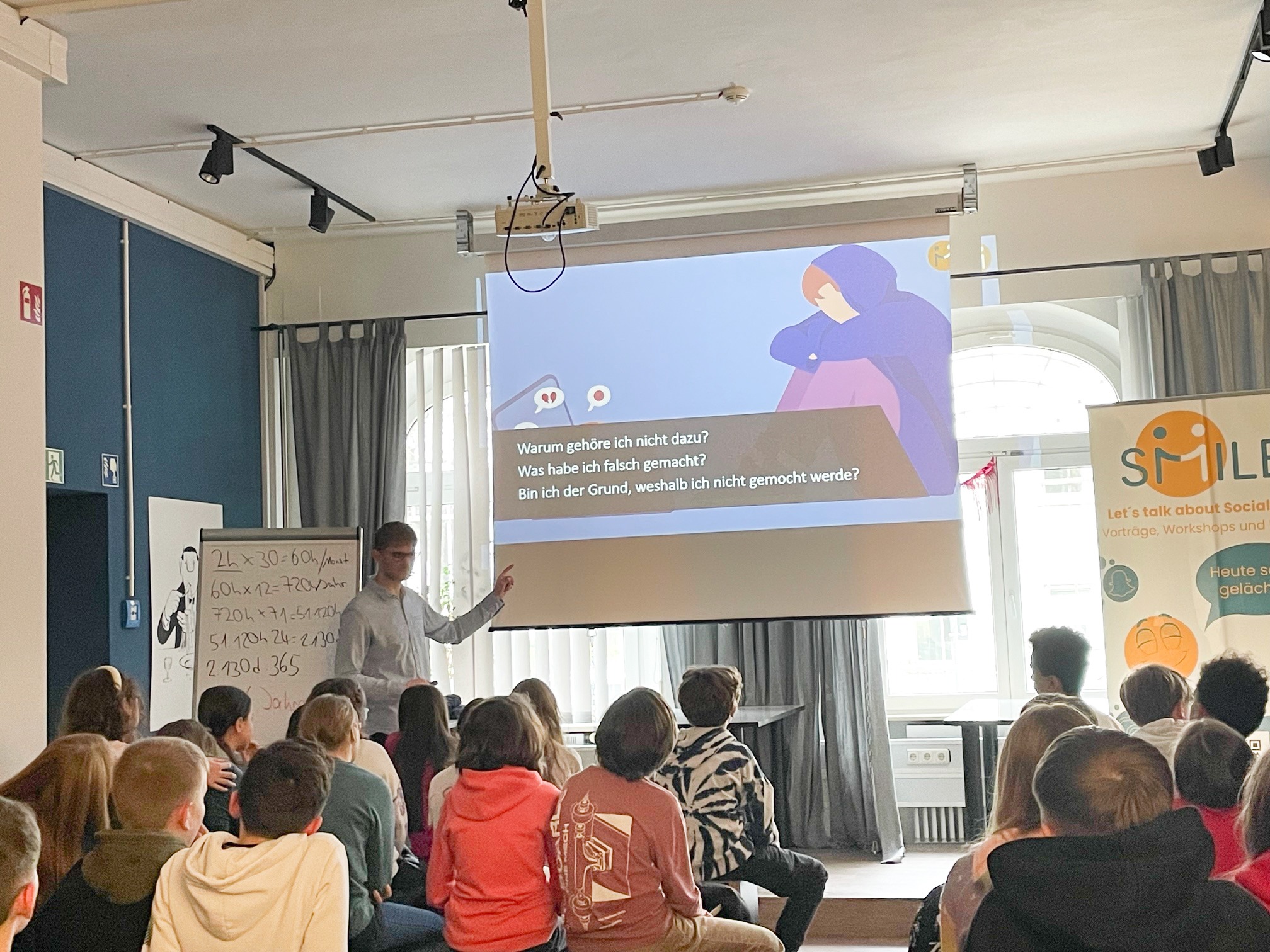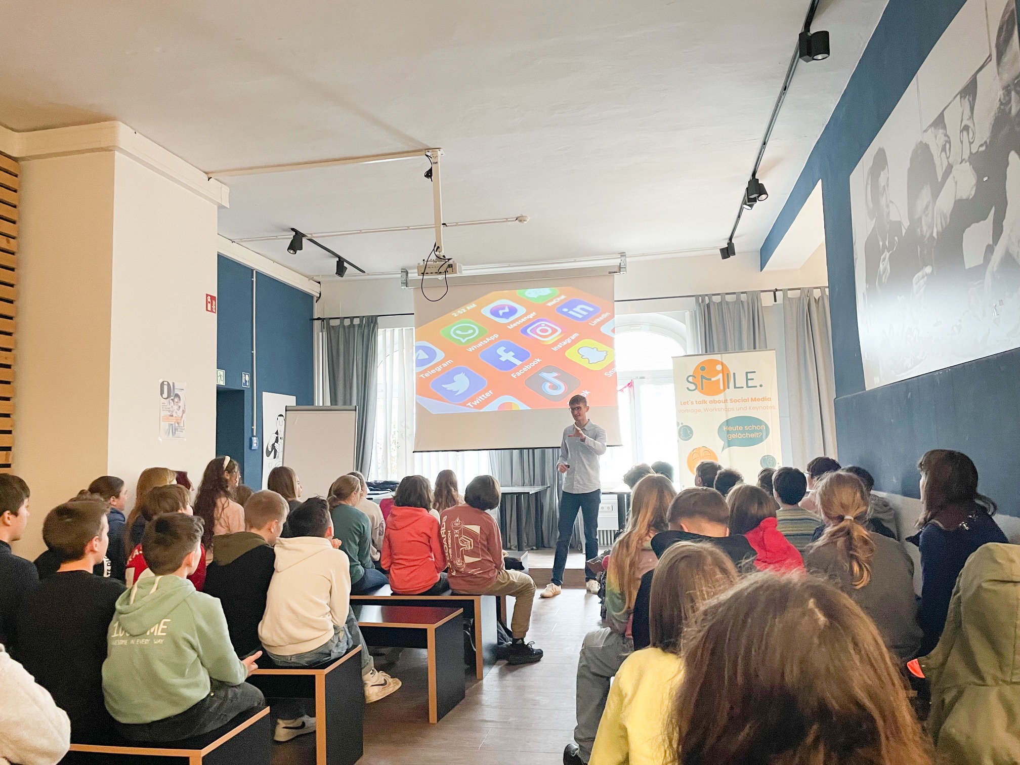 In zwei spannenden Vorträgen wurden die Unter- und Mittelstufe in Kooperation mit Maximilian Knack von Smile Youth über die Themen Handynutzung, Social Media und Cybermobbing aufgeklärt. Es wurde dargestellt, mit welchen Strategien es die Hersteller der gängigen Apps schaffen Menschen an den Bildschirm zu fesseln, oder wie sehr das vermeintlich perfekte Leben der Influencer durch geplante Beiträge und Vorproduktion gesteuert wird.