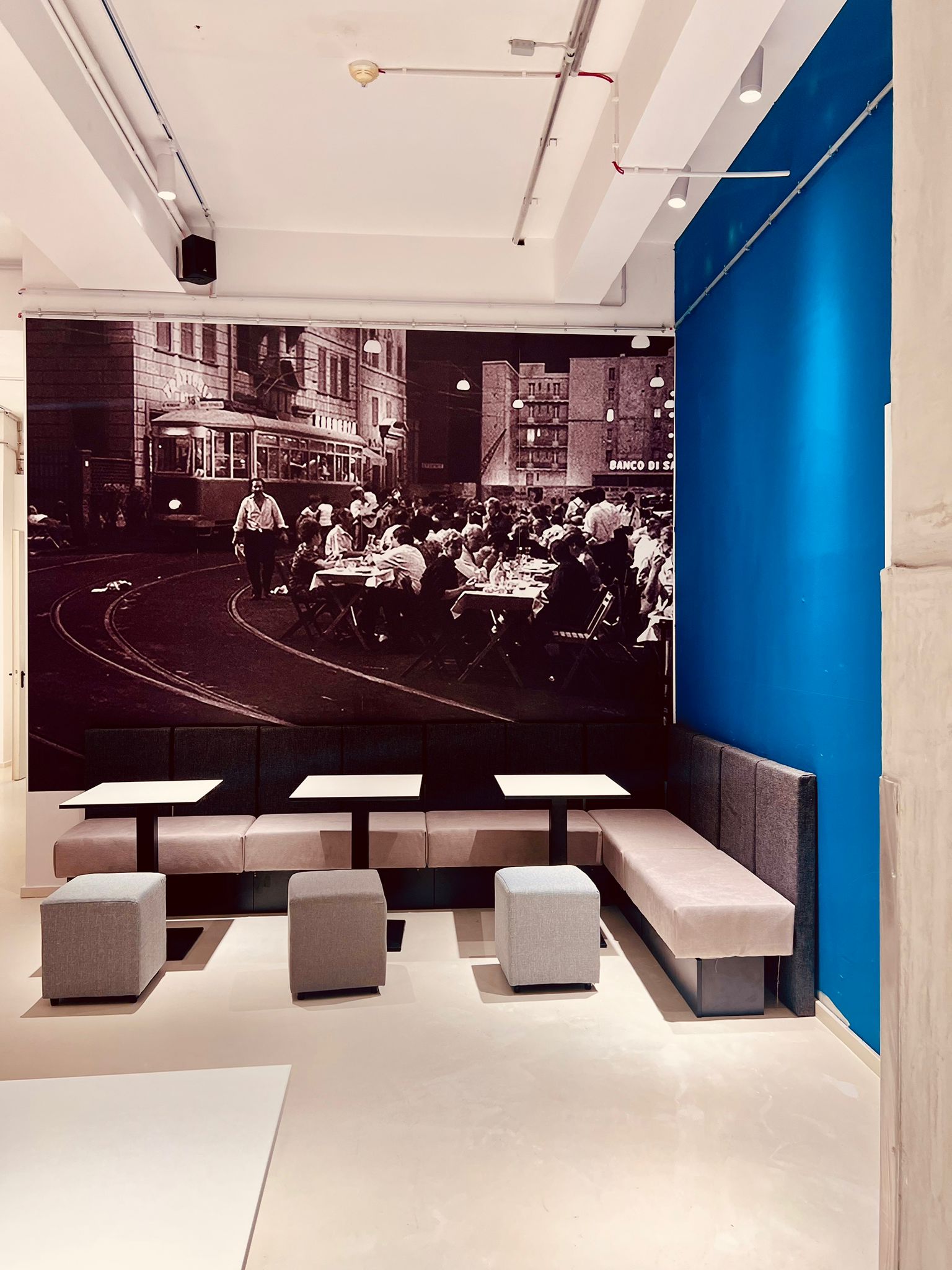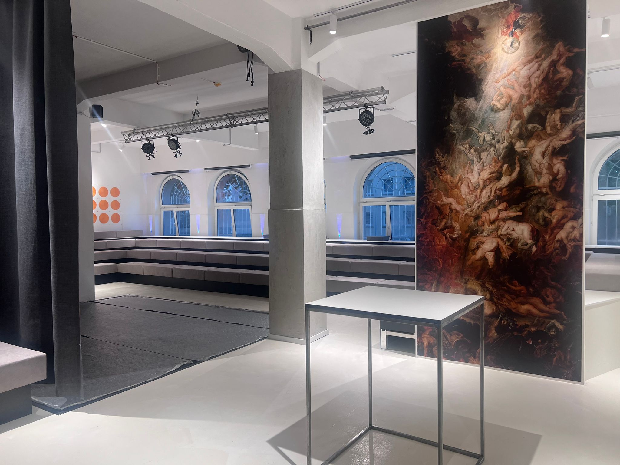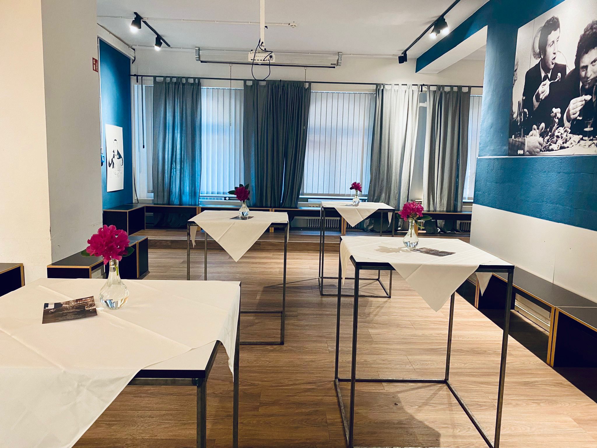 Doch die Mensa lädt zukünftig nicht nur zum Essen ein, sondern vor allem zum Verweilen und Entspannen. Der Bistrobereich bietet gemütliche Sitzgelegenheiten, an denen man sich mit Freunden treffen und gemeinsam die Pause genießen kann. In der Bar – ganz in rot gehalten – gibt es die Möglichkeit, erfrischende Getränke zu genießen. Am meisten freuen sich die Schülerinnen und Schüler über ihren neuen Rückzugsort. Hier können sie nicht nur essen und feiern, sondern auch neue Ideen entwickeln, sich inspirieren lassen und ihrer Kreativität freien Lauf lassen. Die großformatigen Bilder – über Szenen aus Fellinis „Roma“ bis zu Rubens „Höllensturz der Verdammten“ – regen zum Diskutieren, stillen Betrachten und Nachdenken an.